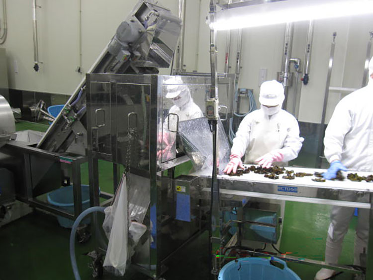 冷凍海藻を量産化するため、支援事業で新たに裁断機、洗浄装置ライン、包装機を導入。洗浄能力が大幅に上昇したため、異物混入率が減り、目視での異物除去作業にかかる時間が大幅に削減。作業人員も削減できました。充填機は、現在は冷凍めかぶを中心に稼働。今後、わかめだけでなく、冷凍海藻全般を広く扱っていくのに役立っています。
